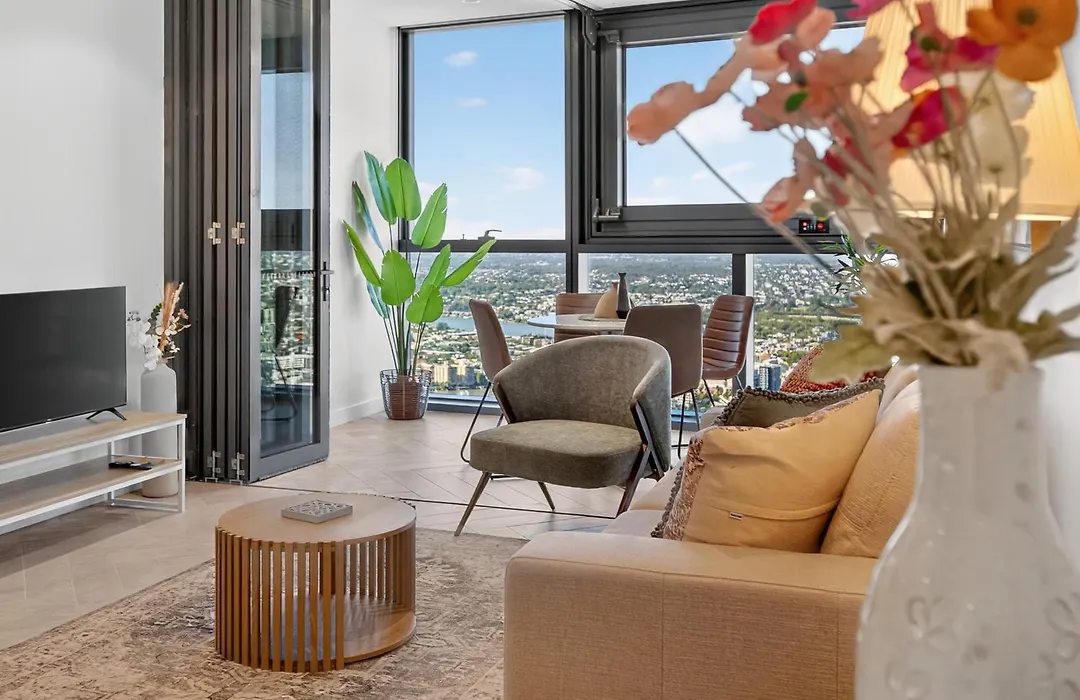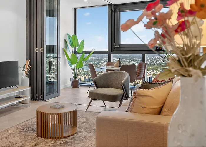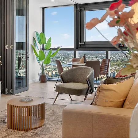 Sky High Zen At Queens Wharf Level 59 Brisbane, un apartamento de 64 m², situado a unos 15 minutos a pie del Río Brisbane, ofrece instalaciones de spa, incluyendo una sauna. El apartamento, con una terraza con vistas a las montañas, está situado al alcance de la Calle Queen.